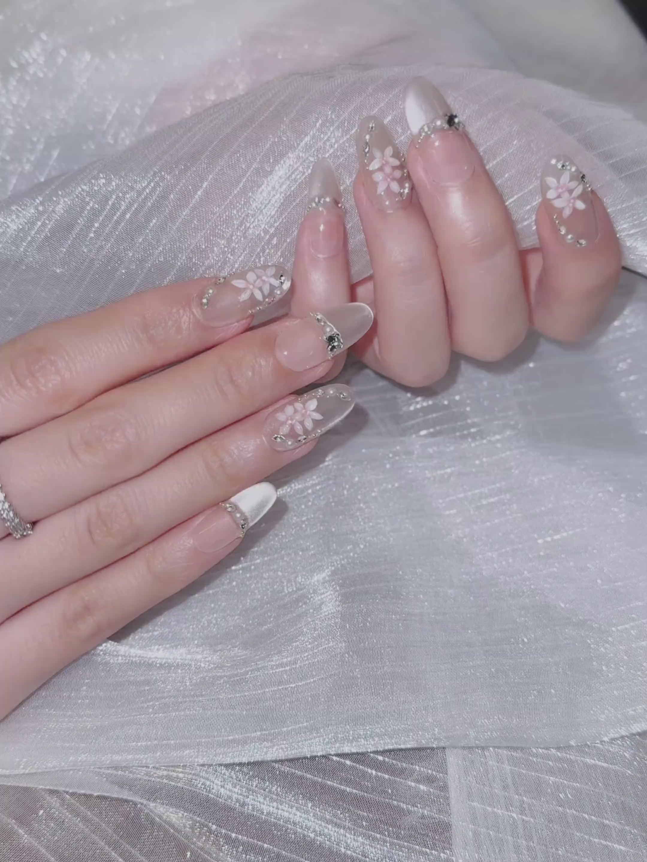 This set pairs a soft nude-pink base with blush-pink cat eye shimmer, finished with tiny hand-painted florals, and delicate crystal accents.
