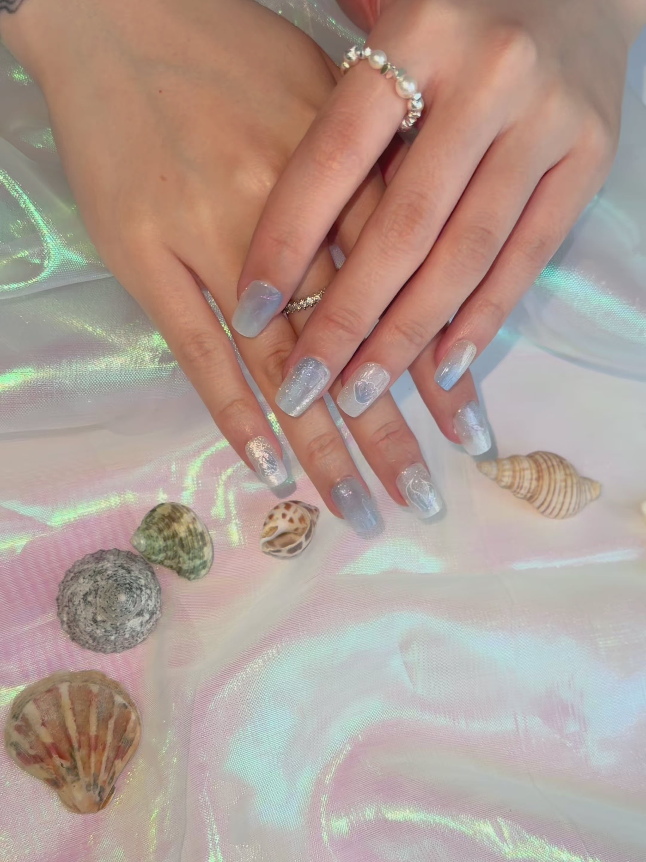 This set features ocean blue shimmer with a soft lavender pearl glow, like moonlight shimmering across midnight water.